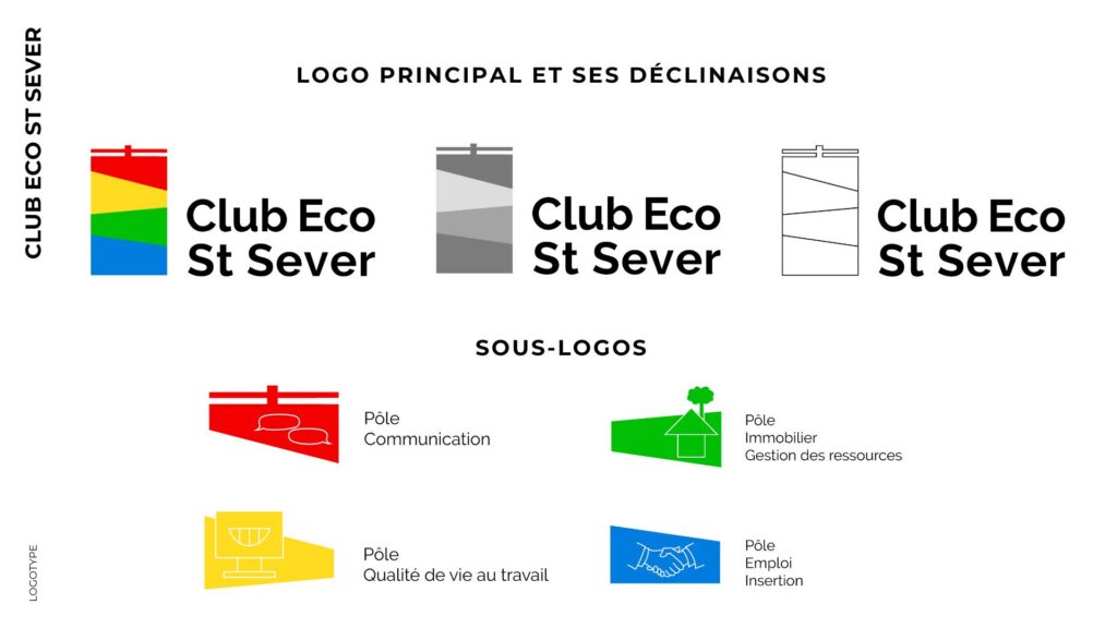 En reprenant la forme caractéristique de la tour des archives et en la subdivisant en différentes sections, nous avons créé un logo modulable, pouvant se séparer en quatre sous-logos représentant les différents groupes de travail du club, chacun associé à sa couleur.